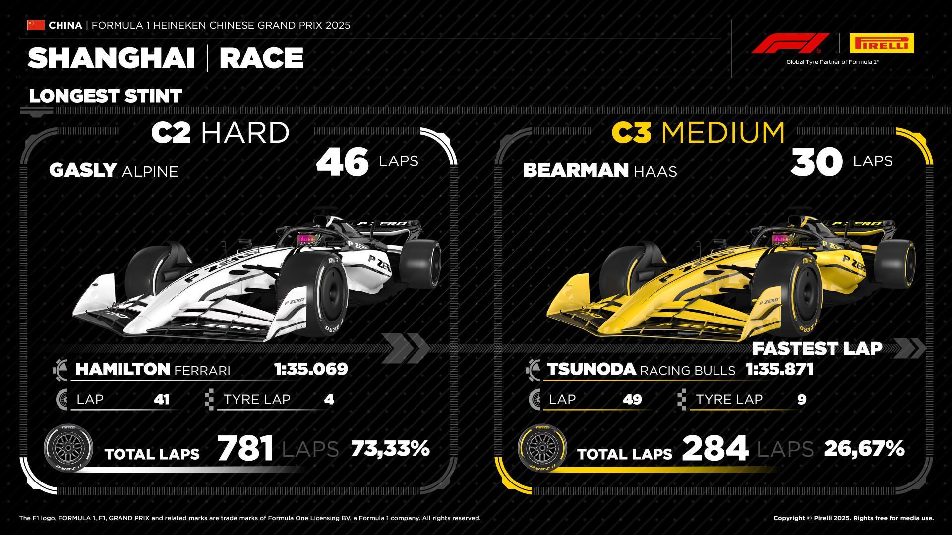 2025赛季,只有三位车手使用硬胎起跑,其余车手都选择了中性胎。全程无人使用软胎。最常见的策略是一停,即在最后阶段使用最硬的轮胎跑很久。赛道数据显示,硬胎的颗粒化程度较低,即使在长距离也能保持稳定的性能。登上领奖台的车手都在第14圈到第15圈之间进站。迈凯伦最终包揽一二,皮亚斯特里最终夺冠,队友诺里斯获得亚军,拉塞尔获得季军。